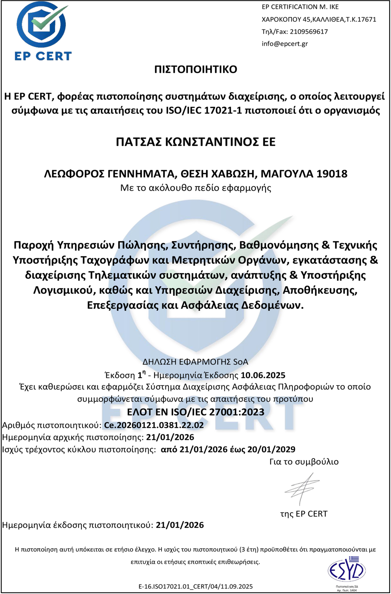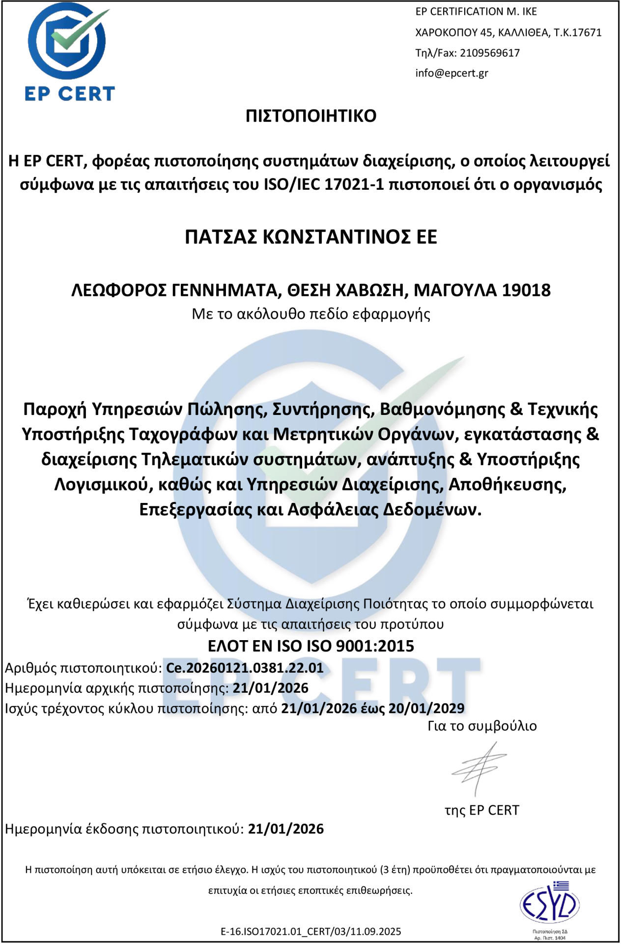 Παροχή Υπηρεσιών Πώλησης, Συντήρησης, Βαθμονόμησης & Τεχνικής Υποστήριξης Ταχογράφων και Μετρητικών Οργάνων, εγκατάστασης & διαχείρισης Τηλεματικών συστημάτων, ανάπτυξης & Υποστήριξης Λογισμικού, καθώς και Υπηρεσιών Διαχείρισης, Αποθήκευσης, Επεξεργασίας και Ασφάλειας Δεδομένων.